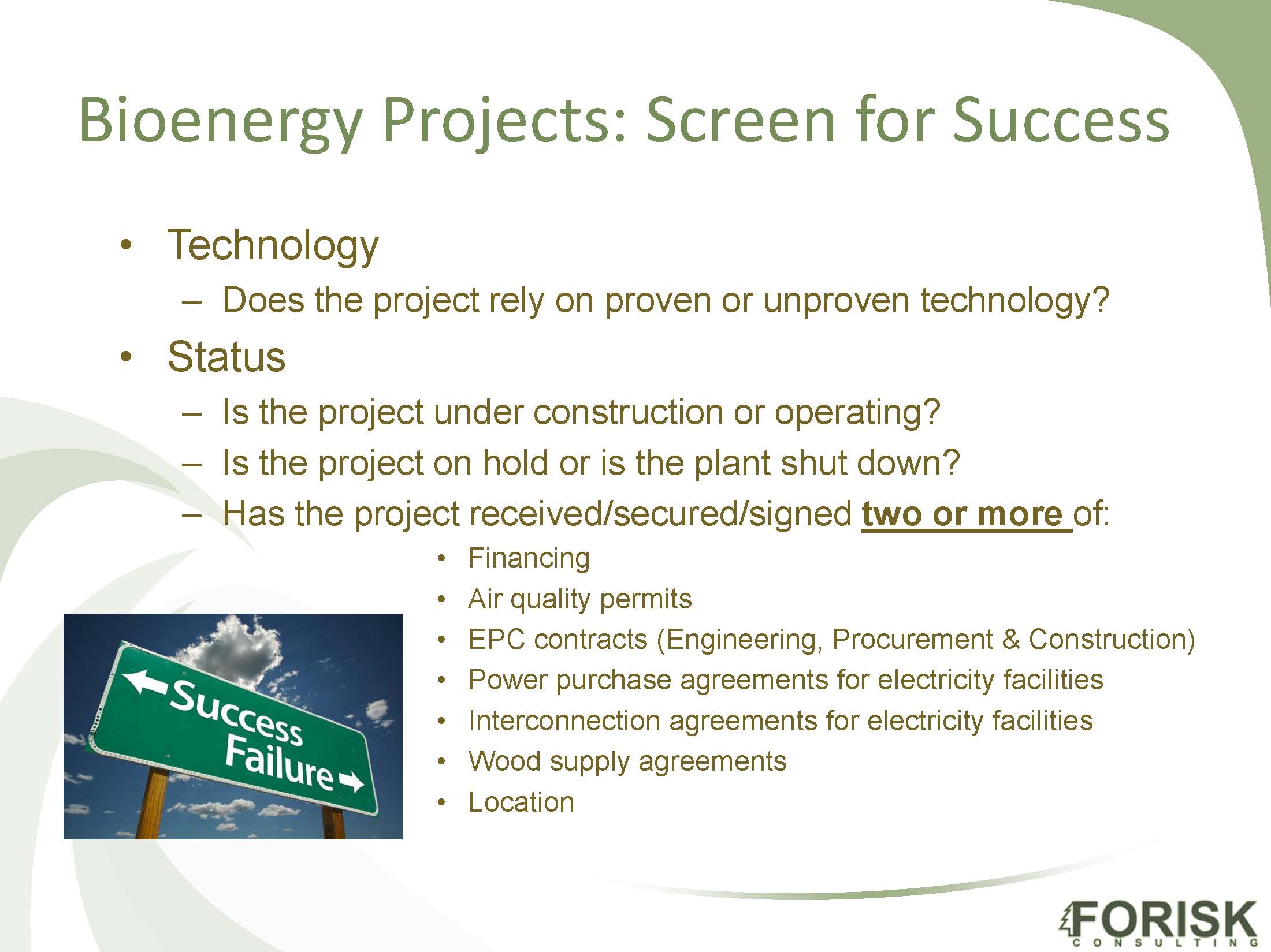 How does Forisk screen projects? Amanda Lang, Managing Editor of Wood Bioenergy US, prepared the following “summary in one slide” to outline the process. (For those interested in the complete history and methodology of the screening process, click here to access our 2010 bioenergy screening white paper.)