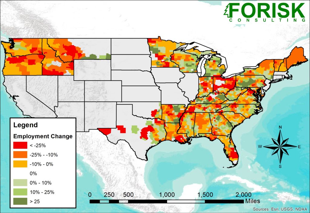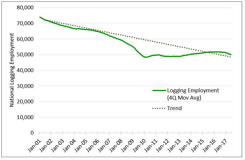 While I hesitate to use the phrase “can’t see the forest for the trees” when analyzing the timber industry, it does feel relevant when tracking trends and processing the floods of data coming at us in the modern world. Peter Senge, an MIT management professor and author said, “Reality is made up of circles, but we see straight lines.” A similar concept that suggests failing to consider the bigger picture misses the real story. Initially, this thought troubled me when evaluating the latest data from the Bureau of Labor Statistics. The data indicates year-over-year logging employment fell in every region of the country for the first time since the recession ended. Does this threaten a growing forest industry? Not necessarily.