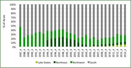 While NCREIF’s two timberland indices capture meaningful samples of underlying data in helpful formats, they suffer from practical and unavoidable limitations that influence broad applications. These limitations include bias, data depth and coverage. For example, while NCREIF covers four distinct U.S. regions, it is primarily a U.S. South index. NCREIF does not apply internationally, nor can it be easily localized to specific properties of markets. In addition, this coverage is specific to a certain class of investors and managers. The figure below highlights the Southern dominance, and the secondarily important role of the Northwest, in NCREIF’s coverage since inception in 1987. In 1987, NCREIF captured fewer than 40,000 acres upon inception; today, NCREIF has data for over 13 million acres.