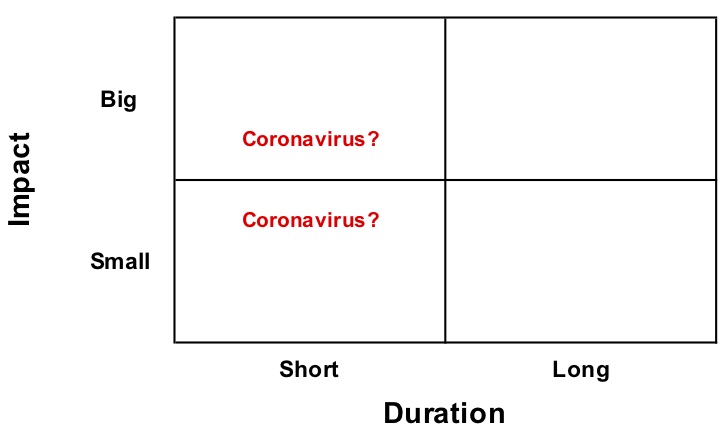 With the coronavirus, analysis of supply side (supply chain) and demand side disruptions varies widely. We struggle to quantify the size and duration of the potential economic impacts. So, we turn to frameworks and scenarios.