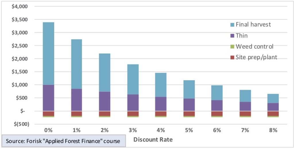 Thank you for this article. Foresters have often argued for lower discount rates because of the long-term nature of the industry and many forestry projects cannot be financially justified without lower rates. However, you raise the important point that those same low discount rates also mean that future risks become more important in a project’s consideration. Forestry has been seen as a low-risk enterprise, but only if there is geographic (and possibly species and product) diversification. Lower discount rates mean that future environmental risks for small forest landowners should not be ignored because their impact in present value terms may well no longer be relatively insignificant. And it may be that with climate change, even geographic diversification may not be enough to mitigate environmental risks.