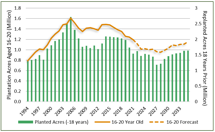 It may seem arbitrary to reflect on the Great Recession 14 years after it’s start (according to the Federal Reserve, the Recession began in December 2007). However, 14 years is the average age of first thinning on intensively managed southern pine plantations, based on our most recent Southern silviculture survey. So, the echoes of the Recession may now be reverberating across pulpwood markets, as well. Reduced sawtimber harvests during and following the Recession reduced the number of replanted acres. Planting and inventory data suggest acreages of stands available for first thinnings could be reduced for a decade or more (Figure 2). While our forest inventory measurements are always backwards looking, we know the acres planted over the past decade will represent our future pulpwood inventory, and, eventually, our sawtimber. Overlaying acres planted in the South 18 years ago over the acres of 16-20 year-old planted pine reveals that acres peaked in 2014 and are on track to trend lower through 2028 before beginning a steady pace of recovery. While thinnings are only a part of the Southern pulpwood picture, it will be important to watch how pine pulpwood prices react over the coming years.