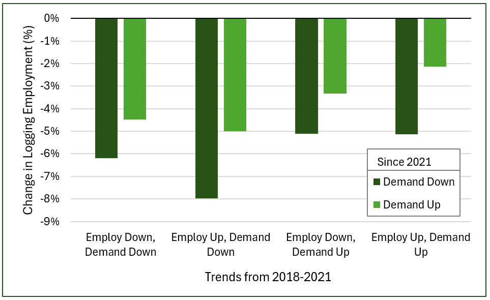 The scale of employment changes, however, varied materially (Figure). Employment fell across all county types whether demand increased or not since 2021, falling 5.6% in total. Employment fell more where demand declined, as we would expect. Where demand declined prior to 2021, logging employment losses were greater in the following years. Counties where employment increased despite falling demand recorded the greatest drop in employment since 2021, falling 7% in total. Recent employment declined least where both employment and demand increased prior to 2021.