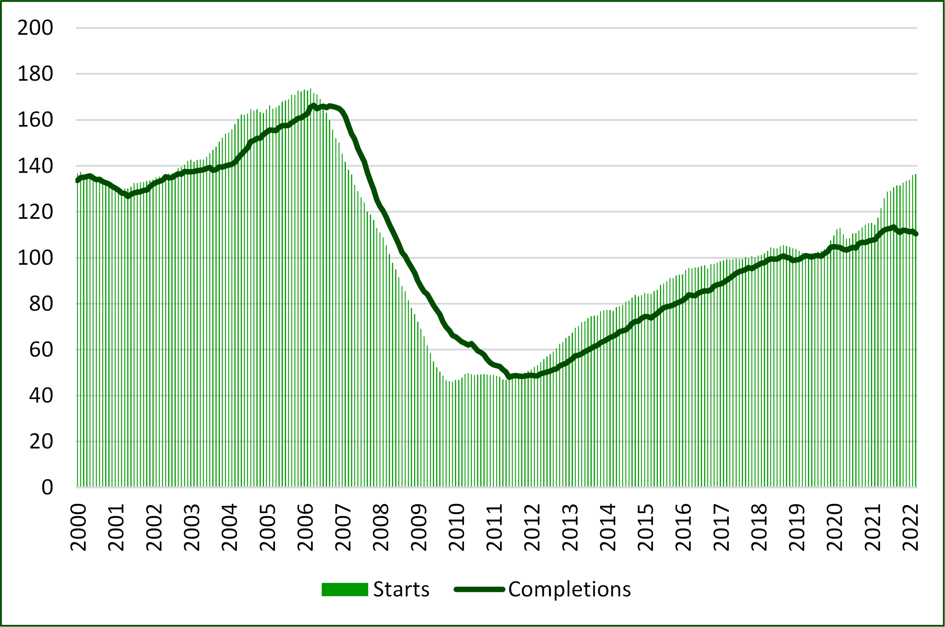 Forisk projects 2022 housing starts of 1.647 million, up 2.9% from 2021 actuals. We assume that underlying demand – based on demographics and household growth, second home ownership, and net replacement of existing housing stock – brings Base Case housing to a long-term trend of ~1.56 million starts. Our current forecast peaks in 2022 at 1.647 million starts before moderating in 2023. The independent housing forecasts captured in Forisk’s Housing Starts Outlook reflect the range of expectations for 2022. For example, PNC leads with a 2022 forecast of 1.75 million while Grant Thornton trails with its most recent forecast of 1.47 million. Current housing start levels are above the long-term average of 1.5 million and are forecast to, on average, remain so throughout the next decade. We are mindful, however, to remember the history of housing starts and expect volatility.