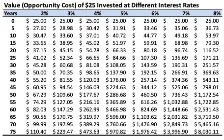 The table reinforces the power of compounded interest across rates and over time. At 6%, $25 approaches $2,000 in 75 years.