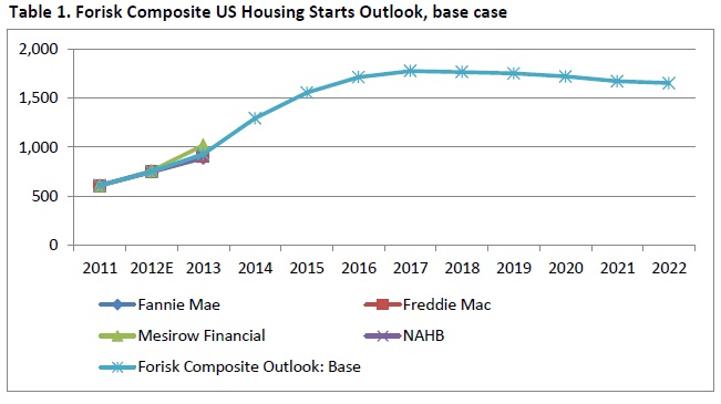 Forisk builds a composite housing starts forecast by relying on publicly-available, independent forecasts from professionals in the housing industry. These include Fannie Mae, Freddie Mac, Mesirow Financial and the National Association of Home Builders (NAHB), as well as long-term assumptions from the Energy Information Administration’s (EIA) model of the US economy (Figure 1).