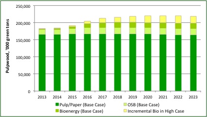 What if we choose to ignore the work of forestry’s leading scientists? To what extent does forest bioenergy drive forest use in the United States? Bioenergy projections in the Mid-Year 2014 Forisk Forecast provide additional context: wood bioenergy markets remain small consumers of pulpwood and chips relative to traditional forest industry markets (Figure). And this won’t change. As noted in a previous post, the economics of the pulp and paper sector and of OSB plants allow them to out-compete wood bioenergy projects for raw material seven days a week.