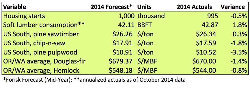 For delivered softwood prices in the Pacific Northwest relative to those reported by Wood Resources International and the Oregon Department of Forestry, the Mid-Year Forisk Forecast was 1.4% higher than actual YTD averages for domestic #2 delivered Douglas-fir along the Oregon/Washington coast, and within 1% for domestic #2 delivered hemlock logs for the same region. Across categories in Oregon and Washington, Forisk projections overestimated 2014 actuals for 2014 by, on average, $6.78 per MBF or 1.1%.