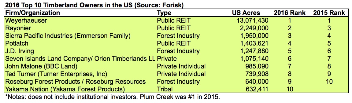 The table below lists the 2016 top 10 U.S. timberland owners by acres, and compares this to their 2015 rankings. Overall, the Weyerhaeuser/Plum Creek merger drove the changes, with Plum Creek dropping off and Yakama Forest Products joining the list at number 10. These 10 owners of U.S. timberland have 24.0 million acres; timber REITs account for 70% of this total. This does not include the approximately 3.0 million acres directly and indirectly controlled by the two largest non-profit conservation owners.