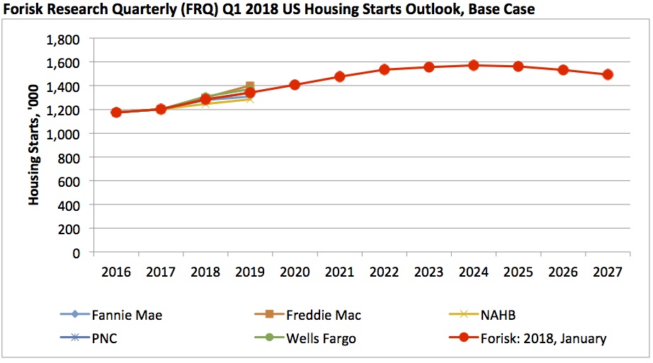 Overall, Forisk projects 2018 housing starts of 1.28 million, up 6.8% from 2017 actuals. Forisk’s 2018 Base Case peaks at 1.57 million housing starts in 2024 before returning to a long-term trend approaching 1.50 million. For comparison, our October 2017 Base Case last quarter peaked at 1.53 million housing starts in 2023 and 2024. The independent housing forecasts captured in Forisk’s Housing Starts Outlook reflect a range of expectations for 2018. For example, Wells Fargo leads with a 2018 forecast of 1.31 million, while the National Association of Home Builders (NAHB) trails with its most recent forecast of 1.25 million.