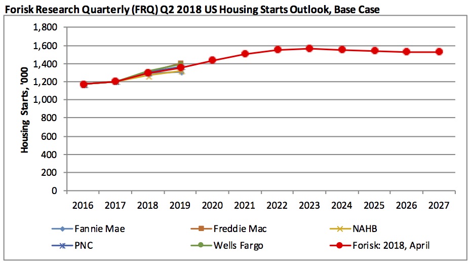 Overall, Forisk projects 2018 housing starts of 1.29 million, up 7.5% from 2017 actuals. Forisk’s 2018 Base Case peaks at 1.56 million housing starts in 2023 before returning to a long-term trend approaching 1.53 million. For comparison, our January 2018 Base Case last quarter estimated 1.28 million starts for 2018 with a peak of 1.57 million housing starts in 2024. The independent housing forecasts captured in Forisk’s Housing Starts Outlook reflect a range of expectations for 2018. For example, Wells Fargo leads with a 2018 forecast of 1.31 million, while the National Association of Home Builders (NAHB) trails with its most recent forecast of 1.27 million.
