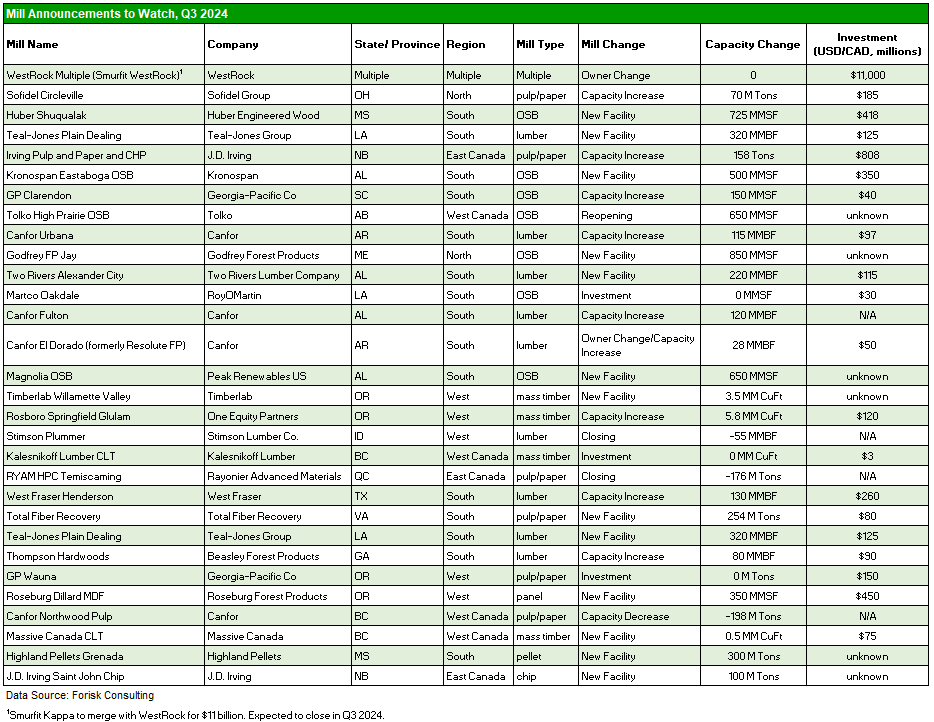 For active projects, Irving Pulp and Paper in Saint Johns, NB announced a $808 million overhaul to the mill complex increasing mill production capacity by 66%. Rosboro will add a 70 MMBF glulam line to the Springfield, OR footprint at a cost of $120 million with completion expected in 2026. Roseburg broke ground on their new MDF and HDF panel mill in the Dillard, OR footprint. RYAM’s HPC pulp mill in Temiscaming, QC and Pyramid Mountain Lumber in Seeley Lake, MT will close operations. Roseburg’s panel mill in Missoula, MT will also close as Roseburg continues to move away from particle board manufacturing. Two Rivers Lumber will construct a 200 MMBF lumber mill in Kellyton, Alabama for $115 million using Peak North America as the contractor. Peak North America will also construct and new 650 MMSF OSB mill in Enterprise, AL called Magnolia OSB. Construction is set to begin July 2024 with expected completion by Q4 2025. Timberlab announced a new 3.5 MM CuFt CLT production mill in the Willamette Valley, OR. Massive Canada CLT in Williams Lake, BC has experienced construction delays for the new mass timber mill that will build housing units and is now planning to commission in H1 2025. Thompson Hardwoods in Hazlehurst, GA plans to complete their lumber mill expansion by the end of 2024.