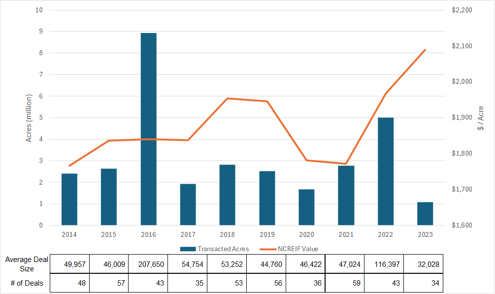 - The pace of timberland transactions is inconsistent and often skewed by large deals in a given year.