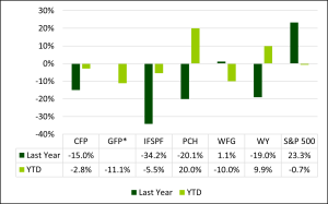 While the shares of public lumber manufacturing and timberland owning firms in the U.S. and Canada fell in 2024, even as the S&P 500 surged, performance has diverged year-to-date. As of March 5, 2025, U.S. based PotlatchDeltic (PCH) and Weyerhaeuser (WY) – both of which also own millions of acres of timberlands – increased in value while firms based in Canada saw their prices fall. Of these firms, only GreenFirst Forest Products has 100% of its lumber capacity in Canada.