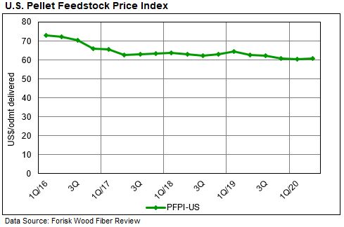 U.S. pellet feedstock fiber prices were stable in Q2 2020, despite the effects of the coronavirus. The U.S. Pellet Feedstock Price Index (PFPI-US)[1] increased 0.2%, reaching $60.60/odmt. Roundwood delivered prices in the U.S. South eased modestly while other feedstock price drivers were volatile. Although most sawmills have returned to operations, at least 13% of U.S. softwood sawmill capacity temporarily curtailed in Q2 2020 as a result of Covid-19.