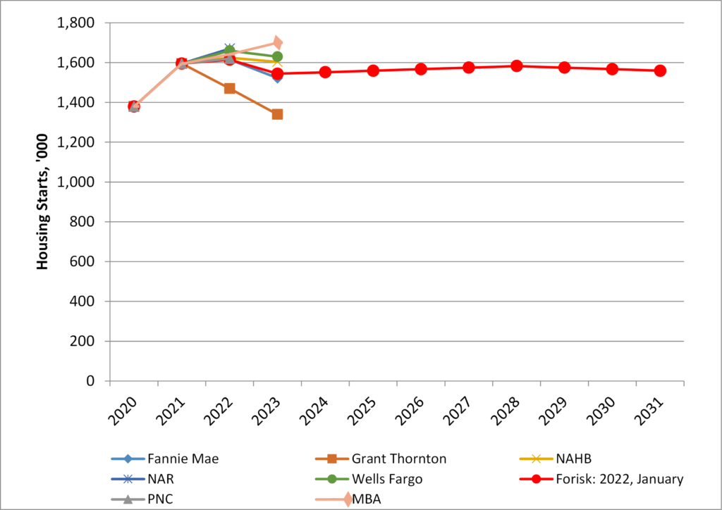 Forisk projects 2022 housing starts of 1.615 million, up 1.2% from 2021 actuals. We assume that underlying demand – based on demographics and household growth, second home ownership, and net replacement of existing housing stock – brings Base Case housing to a long-term trend of ~1.56 million starts. Our current forecast peaks in 2022 at 1.615 million starts before moderating in 2023. The independent housing forecasts captured in Forisk’s Housing Starts Outlook reflect the range of expectations for 2022. For example, NAR leads with a 2022 forecast of 1.67 million while Grant Thornton trails with its most recent forecast of 1.47 million. Current housing start levels are above the long-term average of 1.5 million and are forecast to, on average, remain so throughout the next decade. We are mindful, however, to remember the history of housing starts and expect volatility.