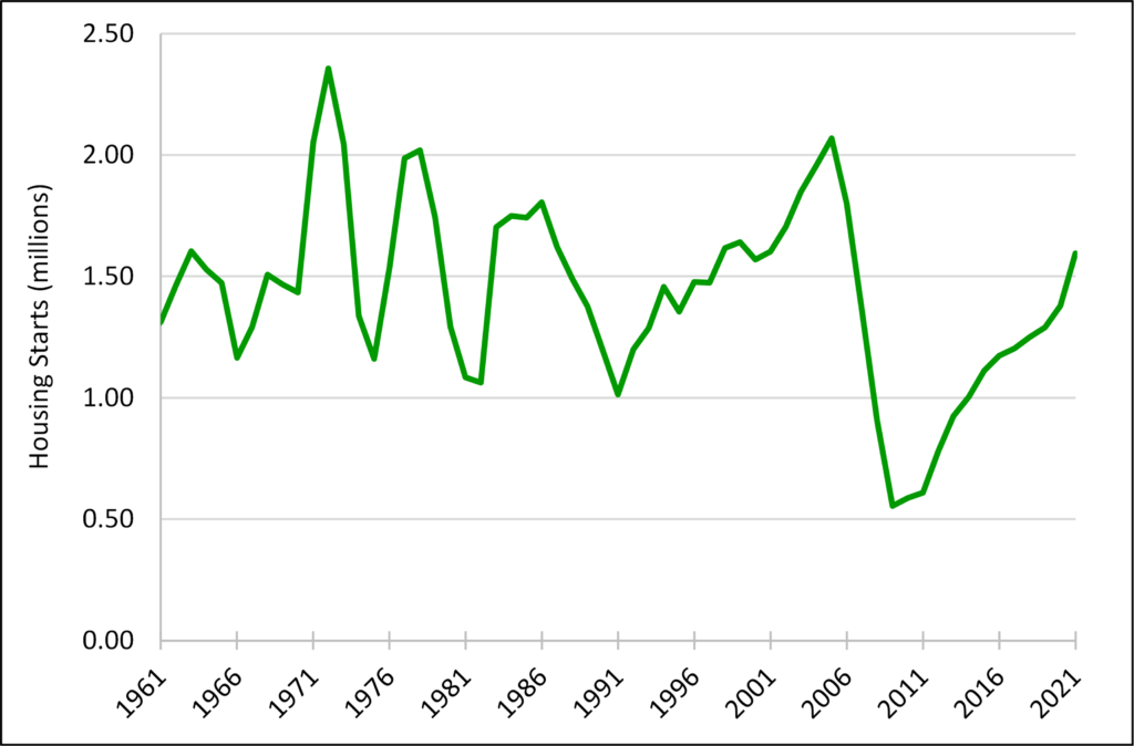 The strength of the U.S. housing industry over the past two years has been an unexpected (but welcome) surprise. At the outset of the pandemic, housing starts were forecast to decline by as much as 14.0% in 2020. Instead, starts rose 7.0% in 2020 and an additional 15.6% in 2021. In fact, housing starts consistently rose over the past decade, from 609 thousand in 2011 to 1.6 million in 2021 (Figure 1). When looking at the history of housing starts over the past sixty years, it becomes apparent just how unusual this decade-long trend is.