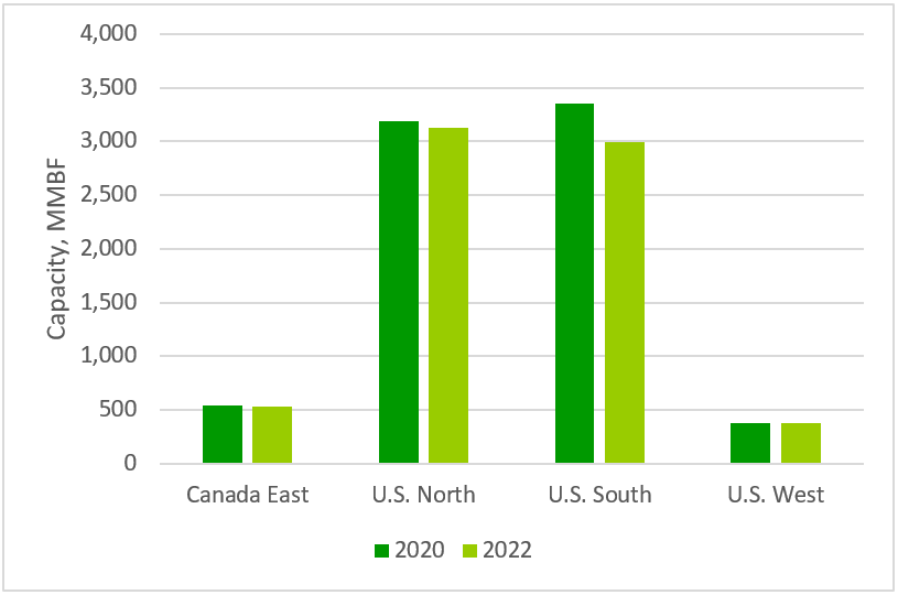 Hardwood sawmills in the Mill Database have the capacity to produce 7.0 BBFT of lumber annually. The U.S. North leads with 3.1 BBFT, followed by the U.S. South. East Canada and the U.S. West make up the balance. The average size of a hardwood sawmill is 14 MMBF (this includes facilities that also mill some softwood). Hardwood lumber capacity declined by 6% from 2020 to 2022 due to mills closing or switching to use more softwood. Most of the decline was in the U.S. South where mills shifted towards softwood species and expanding the capacity of mills to use pine timber, which is less expensive and easier to procure.