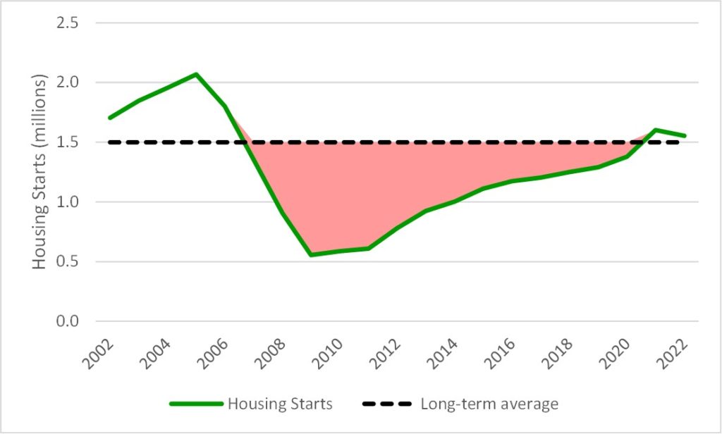 Figure 1: New Privately-Owned Housing Units Started, unadjusted. Area in red shows years of housing starts below long-term average.