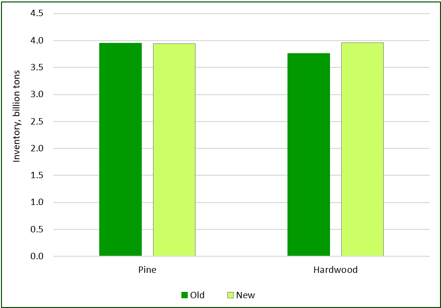 Figure 2. 2019 Merchantable Pine and Hardwood Inventories in U.S. South from Old vs. New (NSVB) Models. Sources: USFS FIA, Forisk Consulting.