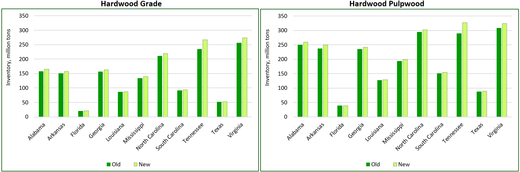 For hardwood, the new models generally increased inventory estimates in all diameter classes. Hardwood grade inventory in the South increased 6% from the new models, with the biggest change in Tennessee (14%) and the smallest change in Louisiana and Texas (2%). Hardwood pulpwood inventory in the South increased 3% from the new models, with the biggest changes in Tennessee (13%) and the smallest change in Louisiana (1%).