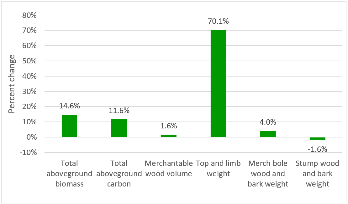 Overall, merchantable wood (stem) volume used by forest industry mills only increased 1.6% in U.S. forests due to new model updates. Most of the change from the new models was in top and limb weight, which increased 70% relative to previous models. Specific impacts vary by tree species and geography.