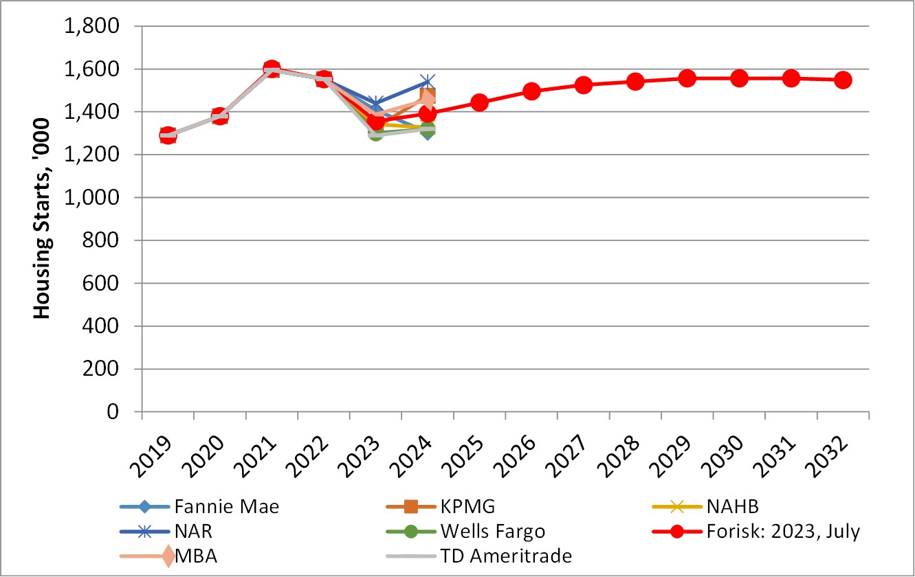 Forisk’s Base Case declines sharply in 2023 before beginning to recover. The forecast peaks at 1.56 million housing starts towards the end of the projection. Despite widespread consensus that housing starts are trending lower for 2023, estimates vary widely for 2024. For example, Fannie Mae forecasts a bearish 2024 with an estimate of 1.303 million starts. Meanwhile, NAR posits a much more bullish 2024, rising back to 1.540 million starts. This represents a range of 237 thousand starts.