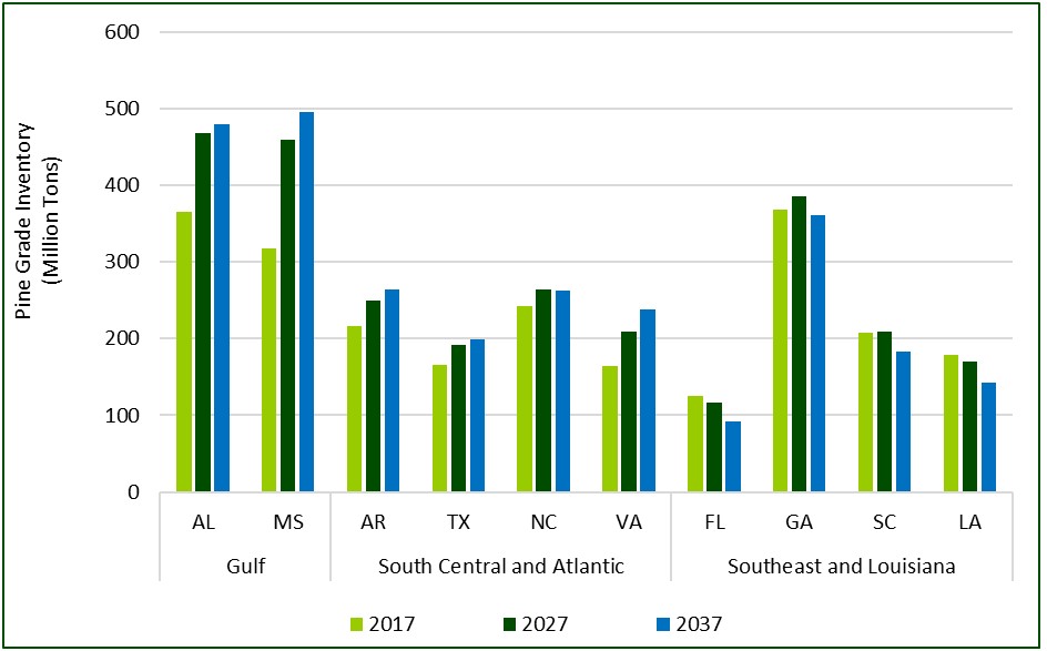 Sawtimber inventories increase substantially in the Gulf States by 30-40% in the next ten years, stabilizing in fifteen years (Figure 1). The South Central and Atlantic states grow sawtimber more moderately, with 10-year increases that average 17%. Sawtimber forecasts for the Southeastern states and Louisiana are stable to declining over the 20-year projection.