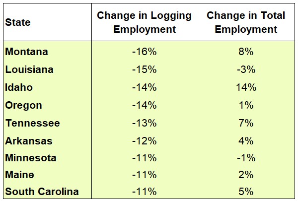 Total employment increased in seven of the nine states, indicating logging employment fell while the workforce in most states rose. Louisiana again stands out as an exception, highlighting general labor concerns there. With substantial investments in sawmill and bioenergy capacity over the last three years, Louisiana wood demand could increase as much as 30% over the next decade. Shrinking harvesting capacity should be a concern.