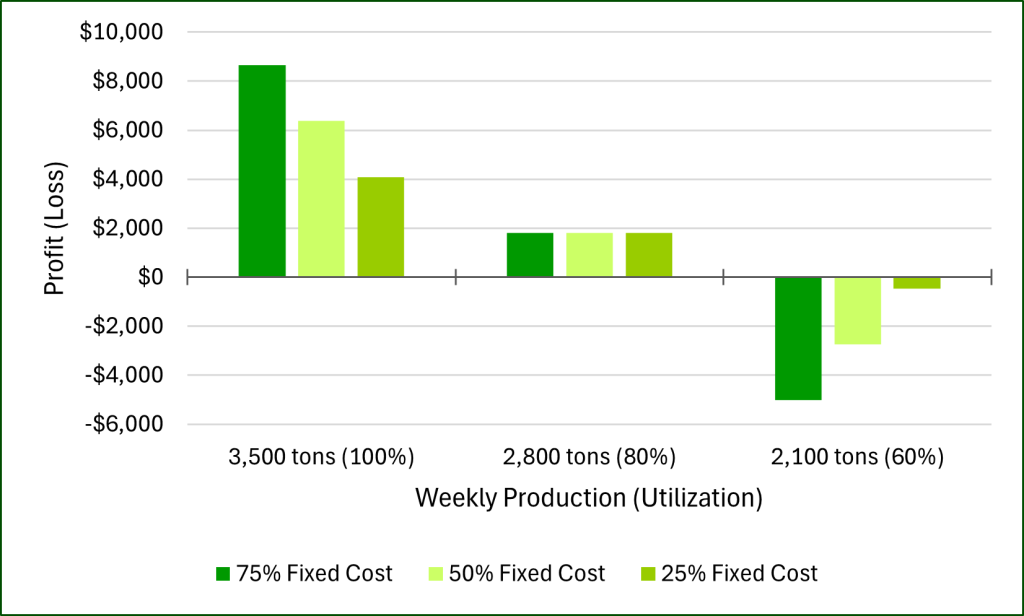 Consider the simple example below. Assume a logging business sets their rate based on the expectation of operating at 80% of their maximum production, which accounts for weather, worker issues, breakdowns, markets etc. After calculating their breakeven cost at this level, they add 5% profit[2]. In this exercise, an 80% utilization delivers around 100 loads of wood per week (2,800 tons) and just under $2,000 of profit. Depending on how their costs are structured, a shift to higher or lower production directly impacts their actual profits. If they have a higher proportion of fixed costs (lots of equipment loans, salaried employees, etc.), quotas limiting their production to 60% utilization would result in losses of $5,000 per week (Figure 1). The business would require three weeks operating at 80% utilization to offset one week running at 60%. Alternatively, this example business would need a 5%-20% higher logging rate (depending on the cost structure) to offset the slower production.