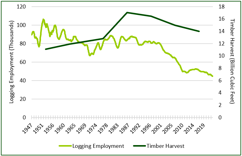 The most recent Bureau of Labor Statistics data on logging employment (covering Q1 2022) showed a 2.5% year-over-year decline in southern logging employment. Falling southern employment is a concern given the geographic shift in forest industry activity towards the U.S. South. The last five quarters of data available in the Southeast and South-Central U.S. marked the lowest logging employment levels on record for those regions. The U.S. logging industry is smaller than it has been since the Bureau of Labor Statistics began tracking data following World War II despite high levels of production (Figure 1). Since timber harvesting levels peaked in the late 1980’s to early 1990’s, through the last reported data in 2016, total harvest levels fell 18% while logging employment declined nearly 40%. Industry output increased over the last five years in step with growing housing demand, suggesting harvest levels rose as well, yet employment continues to fall.
