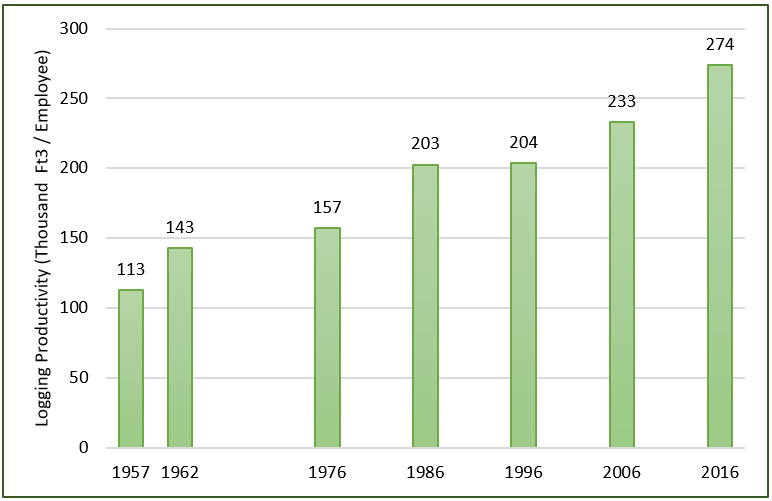 Maintaining (or growing) harvest levels with declining employment is not possible without continued improvements in logging productivity. In fact, since the late 1950’s, logging output per employee is up nearly 150% (Figure 2). Growth came in phases through much of the 20th century, with development of reliable, single-operator chainsaws, followed by dedicated logging machinery leading to step changes in productivity in the 1960’s and 1980’s, respectively. Improved logging productivity (largely through mechanization) enabled the contraction in employment while total output grew. Since the early 2000’s increased adoption of mechanization (particularly outside the U.S. South) and improved utilization allowed further growth, with productivity up 35% since the late 1990’s. Failing further technological innovations, the forest industry will be constrained by logging capacity if the logging workforce continues to shrink.