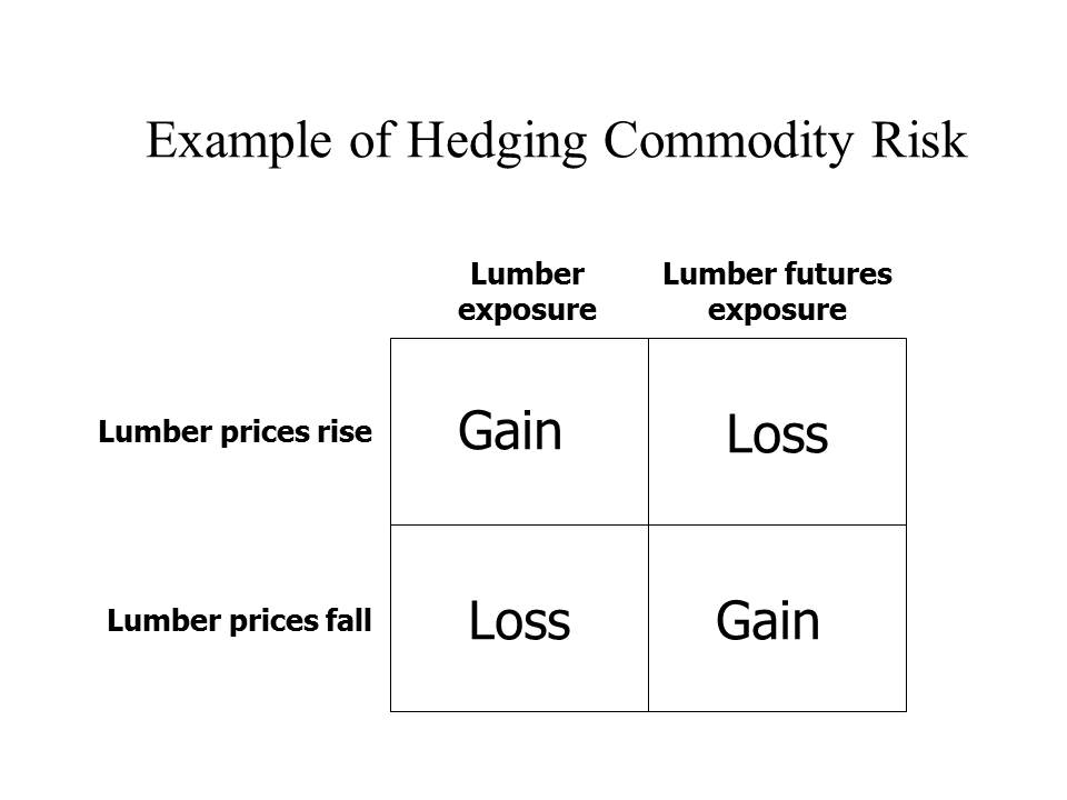 Let’s name our parts. Derivative securities “derive” their value from the prices of other underlying assets, such as stocks, bonds, currencies or commodities (i.e. wheat, gold or lumber). The most common of these financial instruments are forwards, futures and options. In theory, these derivative securities manage exposure to risks associated with the underlying assets. They do this by locking in prices and volumes in advance, thereby reducing uncertainty. For example, a lumber manufacturer can lock in prices for future lumber sales by buying lumber futures contracts traded on the Chicago Mercantile Exchange (www.cme.com). If lumber prices go up, the gain in the lumber sales price is offset by the loss from the lumber futures contract. If lumber prices fall, the loss in the lumber sales price is offset by the gain from the lumber futures contract.