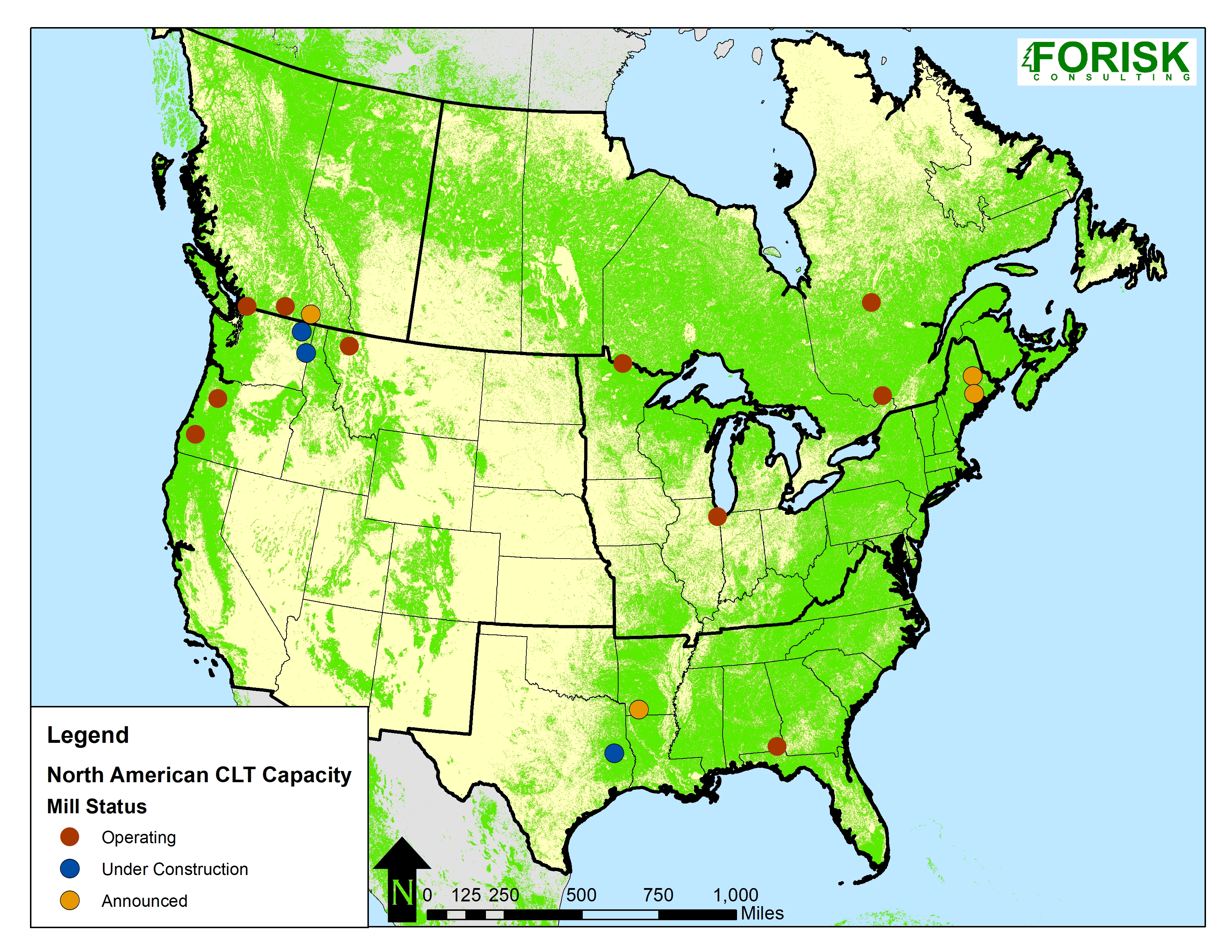 CLT offers structural properties that make it cost competitive with steel and concrete in certain building applications. It is a multilayer wooden panel of kiln dried lumber glued perpendicular to the previous layer. Originally developed in Europe, production of CLT came to North America in 2010. Today, there are 17 operating or announced CLT facilities in North America (Figure). Despite strong growth over the past decade, relative to the total North American panel and lumber markets, CLT remains in its infancy. It sits on the margin of more established engineered wood products, which are themselves modest sized markets. In 2018, North American Glulam production was less than one-half of one percent (<0.5%) of softwood lumber production. Meanwhile, LVL production approached 2%.