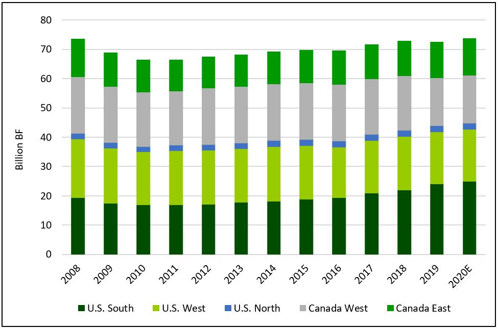 Mill capacity in North America has shifted South since just before the Great Recession of 2007-2009 for softwood lumber. Reduced timber supplies in Western Canada from the mountain pine beetle made it hard to get wood in the region. The U.S. South has ample timber supply and a solid infrastructure to move wood to mills. Softwood lumber capacity in North America is on-par with levels back in 2008 (12 years ago), with shifts regionally. Capacity increased in the U.S. South starting in 2012 and the region is projected to reach 24.9 billion board feet of capacity soon. The South surpassed Western Canada to become the largest region in North America for softwood lumber capacity a few years ago, and the shift continues. Mills closed in Western Canada and the region lost over 2 billion board feet of softwood lumber capacity in the last two years.