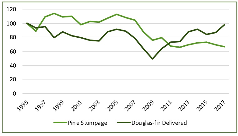 Indexed Domestic Sawlog Prices: South versus Pacific Northwest (1995=100)