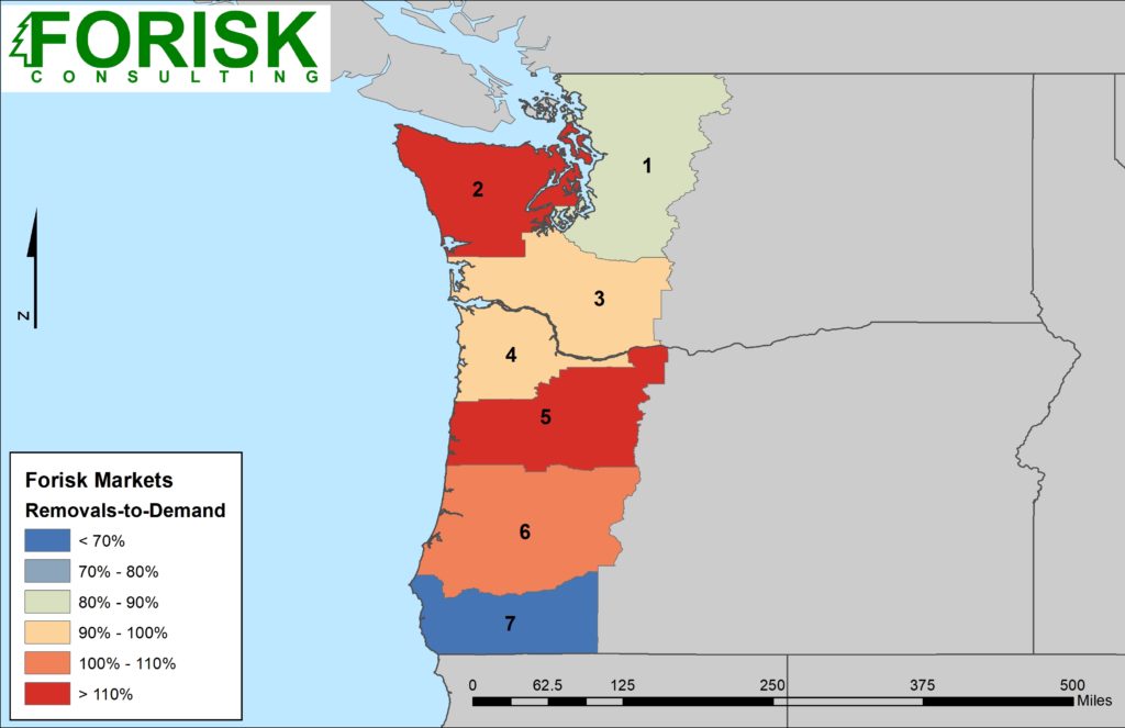 One common measure of relative supply, growth-to-drain, relies on data from the U.S. Forest Service. It provides a current snapshot of how “balanced” the supply is to demand using the volume of harvest removals relative to the annual growth. Regional disparities in how data is collected (more frequently in the South than the West) and market dynamics (i.e. more public timber in the West vs. limited supply in the South) require a different approach to estimating relative supplies in the West vs. the South. To provide a current snapshot of available supply in the West, we instead calculated the proportion of sawtimber demand met by harvests within each market. If harvests from public land or wood from outside the market are needed to meet current demand, timberland owners should be in a favorable position, as demand from private land should be high. We used public harvest data from the Oregon Department of Forestry and Washington DNR in combination with Forisk’s wood demand derived from our North American Mill Capacity Database.