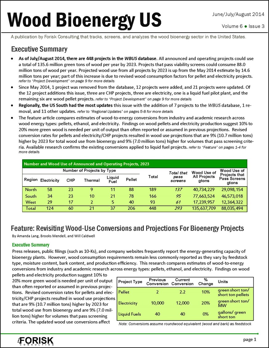 Wood Bioenergy US (WBUS) is a publication by Forisk Consulting that tracks, screens, and analyzes the wood bioenergy sector in the United States. This issue’s feature article compares estimates of wood-to-energy conversions from industry and academic research across wood energy types: more…