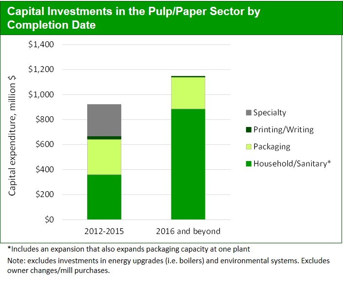 Pulp and paper mill upgrades made between 2012 and 2015 totaled $0.9 billion and included investments in household/sanitary products, packaging, and specialty papers. In 2016 and beyond, 77% of announced upgrade projects occur within the household and sanitary category.
