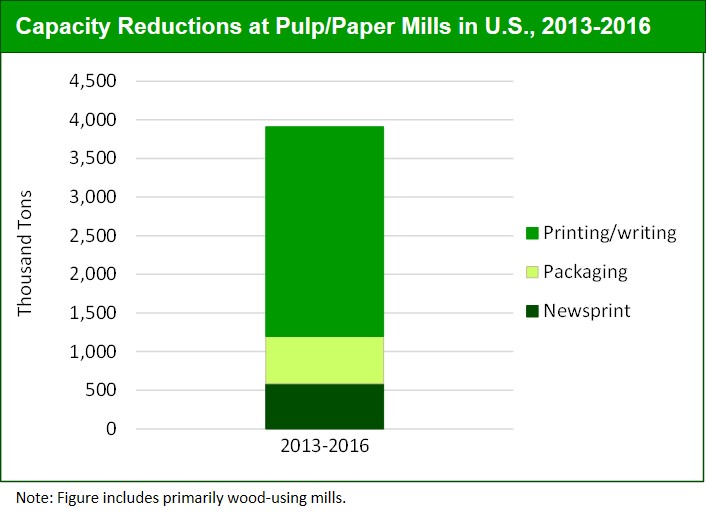 Pulp and paper mill closures and capacity reductions in the U.S. reduced annual output by over 3.9 billion tons from 2013-2016.