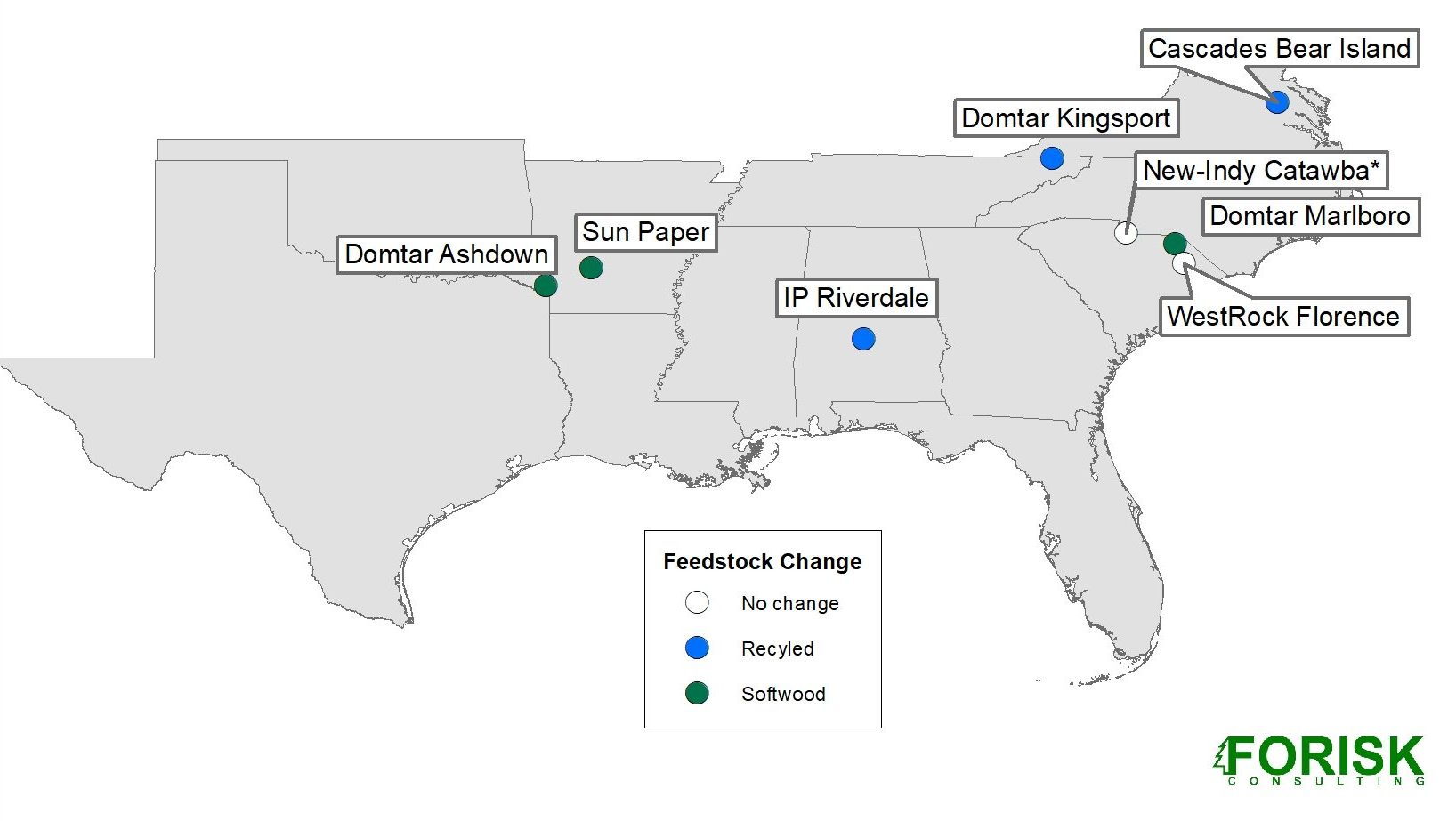 Let’s look at some of the planned projects. Of the eight announcements included in the map below, three will use recycled containerboard as all or part of their mix: Cascades Bear Island, Domtar Kingsport, and IP Riverdale. This could shift wood use away from softwood roundwood and hardwood chips at these facilities. WestRock Florence will likely have no or a limited change to wood use. Domtar’s Marlboro and Ashdown facilities and Sun Paper could have an increase in softwood use, with some decrease in hardwood use. Bottom line: impacts will be localized and highly dependent on the procurement strategies of the particular mills.
