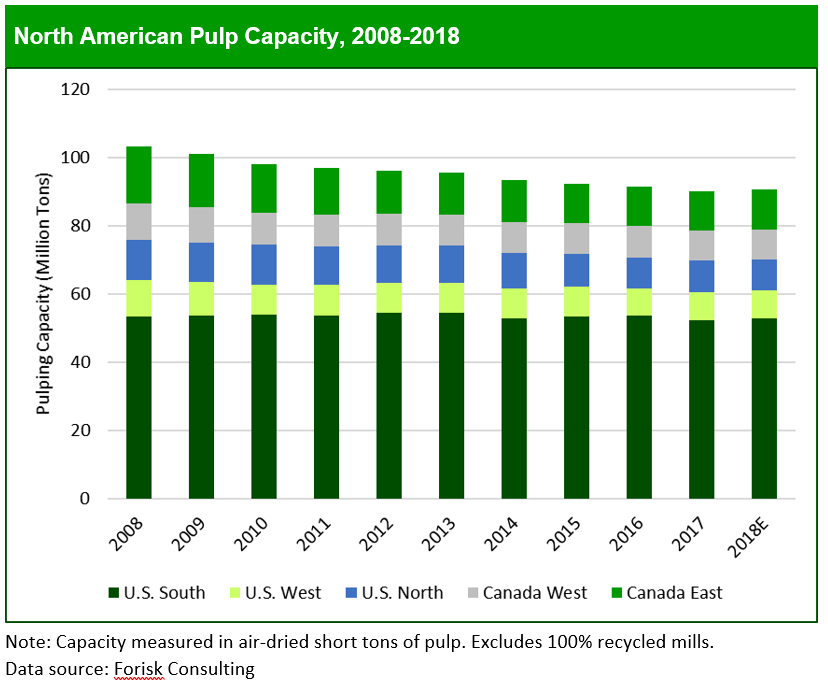 This post contains an excerpt from Forisk’s Multi-Client Study: North American Forest Industry Capacity, a comprehensive analysis of wood-using capacity – current, historic and projected for 2008-2020 – by firm and sector across five North American regions. For more information, click, here.