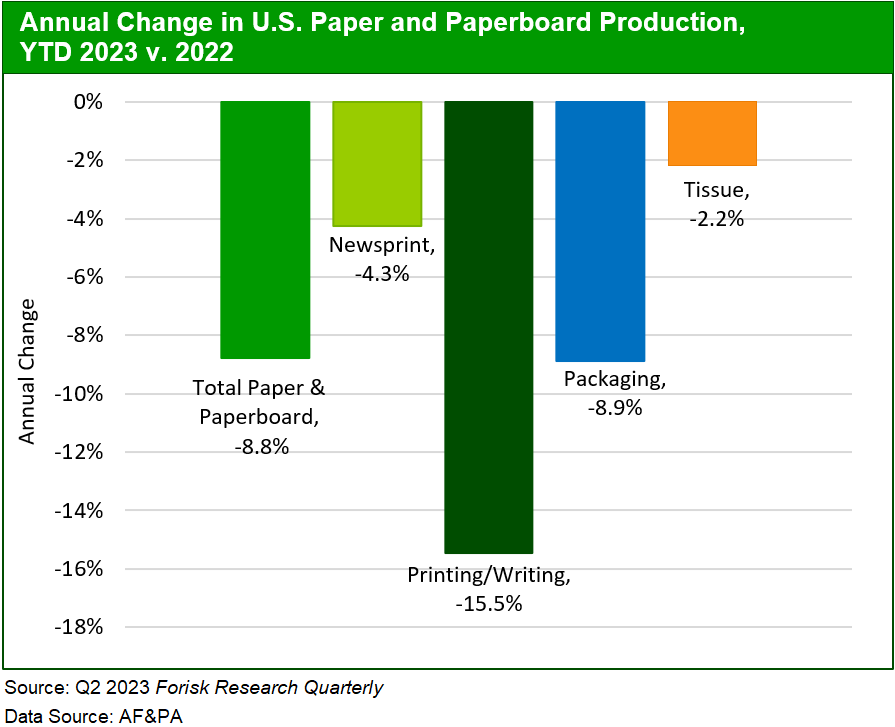 What is driving the pulpmill slowdown? We published the Q2 issue of the Forisk Research Quarterly earlier this month, including updated pulp and paper production data from AF&PA. Paper and paperboard production dropped 9% year-over-year in the first quarter of this year. Printing and writing paper production dropped 16% year-over-year, and it dropped 9% last quarter. Newsprint production continued a slow, steady decline, down 4.3% year-over-year and 3% for the quarter. One of the big changes recently is the decline in packaging production. Packaging production slowed in September 2022 and is 9% below year-ago production levels despite a 3% increase over Q4 2022. Tissue production also fell year-over-year by 2%, despite a 1% rise from Q4.