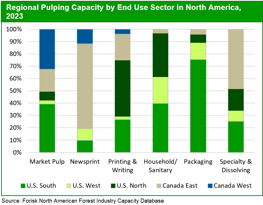 The packaging decline is meaningful as packaging makes up 73% of pulp/paper mill capacity in North America, according to Forisk’s North American Forest Industry Capacity Database. In addition, 76% of the packaging mill capacity is located in the U.S. South. The slowdown in the sector is impacting mills and forest owners in the South more than other declining sectors like newsprint and printing and writing papers, which are more concentrated in eastern Canada and the U.S. North. The dip in packaging production also hits the Pacific Northwest, as packaging accounts for 78% of mill capacity in the region.
