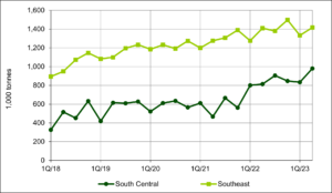 The Southeast region has historically and continues to be the largest wood pellet exporting region in North America. Exports in Q2 2023 totaled 1.4 million tonnes, a 49% increase when compared to five years ago in Q2 2018. According to the Forisk North American Forest Industry Capacity Database, the South Central region continues to attract pellet production capacity investment, including projects like Enviva Lucedale, Enviva Epes, CM Biomass Jackson and CM Biomass Quitman. With some capacity already coming online, the region is setting a record for exports at 981 thousand tonnes, up 90% since Q2 2018.