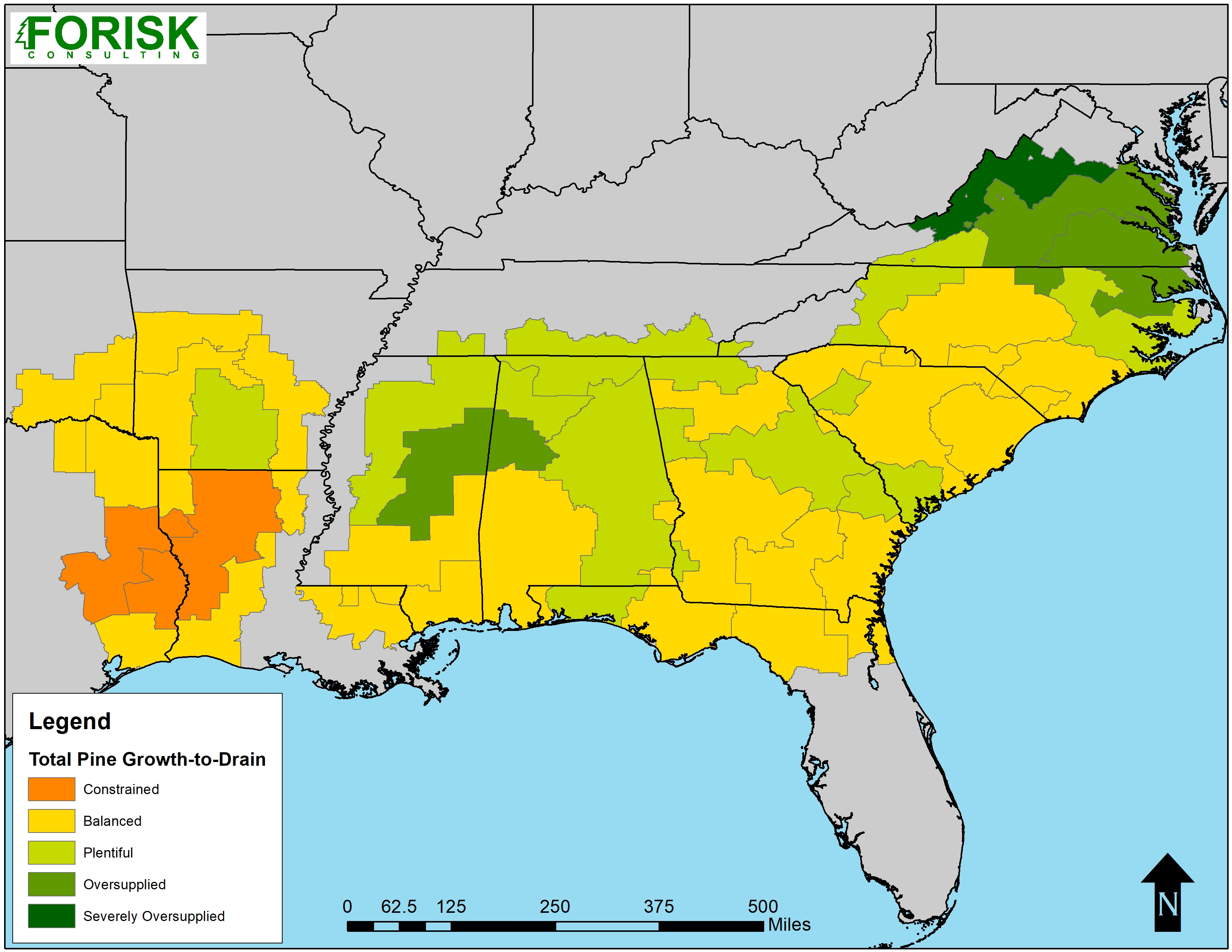 Market rankings must take into account the issues relevant to those deploying capital. For timberland investors, these include the health and diversity of local markets for timber. For wood-using manufacturers, key questions include the availability and sustainability of wood supplies, residual markets, and loggers. As shown in Figure 1, total private pine growth-to-drain ten years in the future paints a “balanced” picture for many markets that, today, look aggrieved to timberland owners. Forisk’s rankings highlight the importance of timing and product specifications.