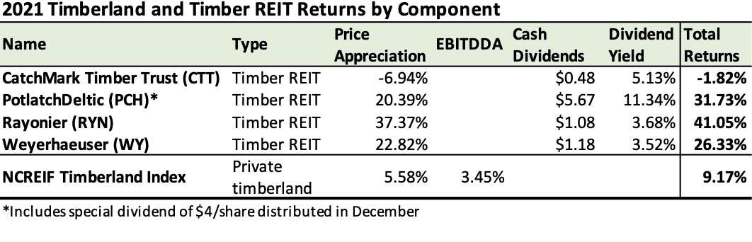 The price appreciation for the timber REITs assumes investors bought shares on December 31, 2020 and sold them on December 31, 2021. The dividend yields are based on the share price upon acquisition. Absent the special dividend payment, PotlatchDeltic’s dividend yield would have been 3.34%, in line with Rayonier, Weyerhaeuser and the 3.45% earnings (EBITDDA) generated by private U.S. timberlands during the year.