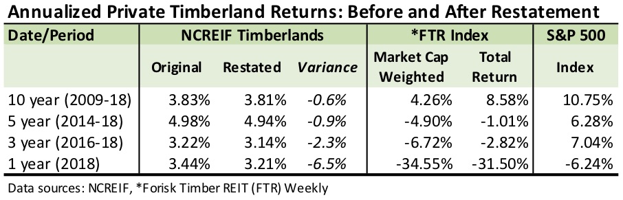 On February 28th, NCREIF – the National Council for Real Estate Investment Fiduciaries – sent out a note regarding a restatement of the Q4 2018 Timberland Property Index. Timberland investors, investment managers, and industry researchers and analysts (e.g. Forisk) often cite this index for benchmarking private timberland investment performance. NCREIF’s note included the following summary: