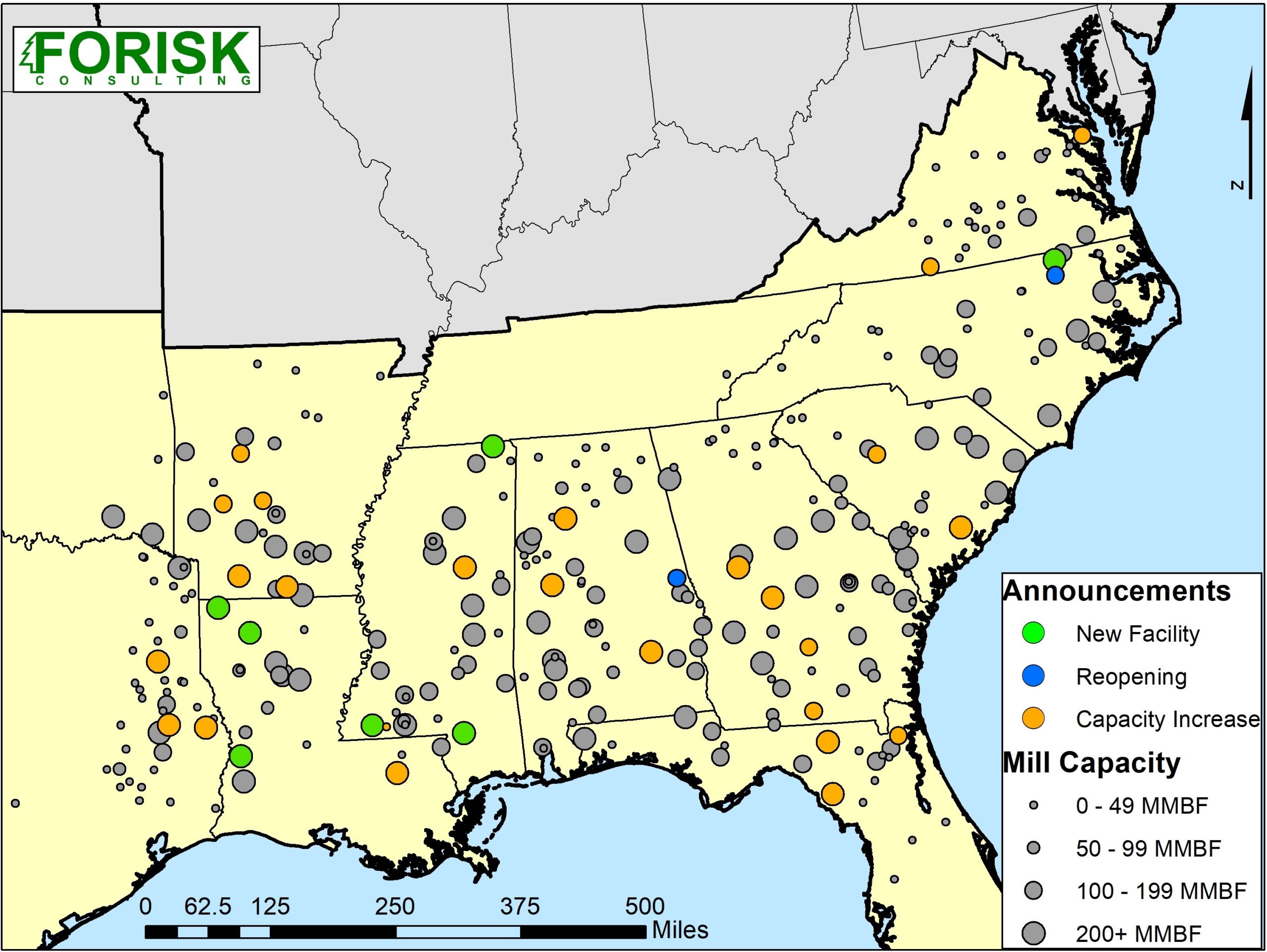 For market intelligence and tracking of timberland and mill investments, consider the Forisk Market Bulletin. To produce custom reports and maps, check out Forisk’s North American Forest Industry Capacity Database. Discounted rates available for companies that also subscribe to the Forisk Research Quarterly (FRQ). Email hsclark@forisk.com for pricing information and to place an order.