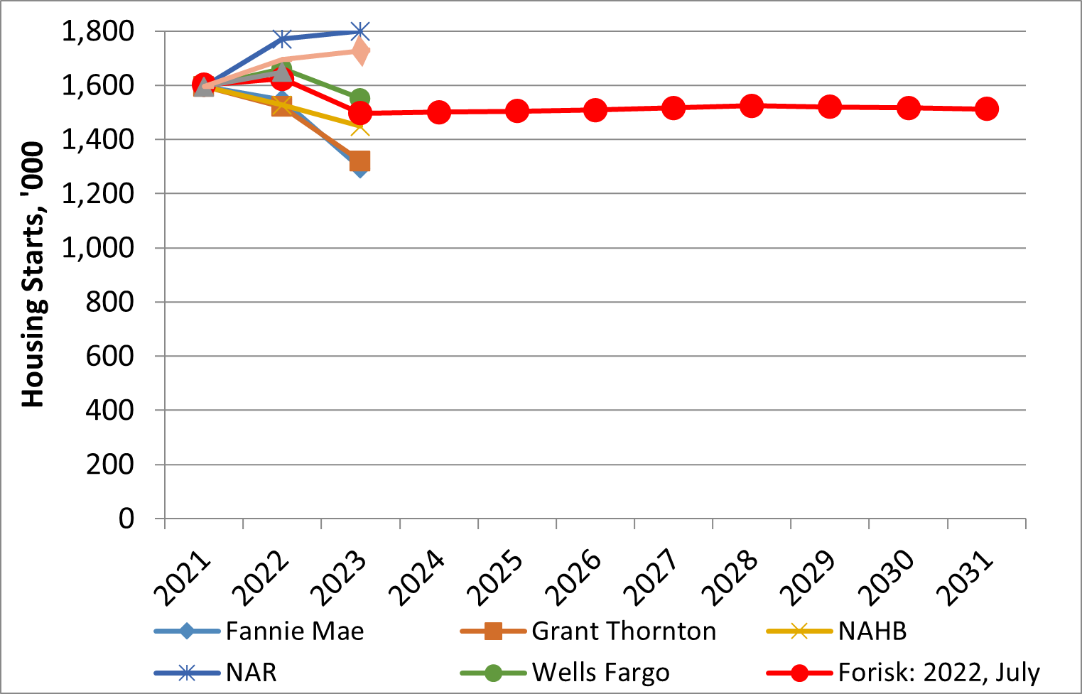 Each quarter when updating our Forisk Research Quarterly (FRQ) forecast models, we revisit prior projections and review applied research on business and economic forecasting. Forisk’s Housing Starts Outlook combines independent forecasts from professionals in the housing industry [4]and applies long-term assumptions from the U.S. Energy Information Administration (EIA) and Harvard’s Joint Center for Housing Studies to establish the peak and trend over the next ten years (Figure 1).